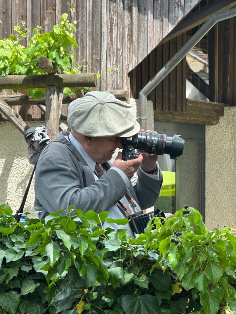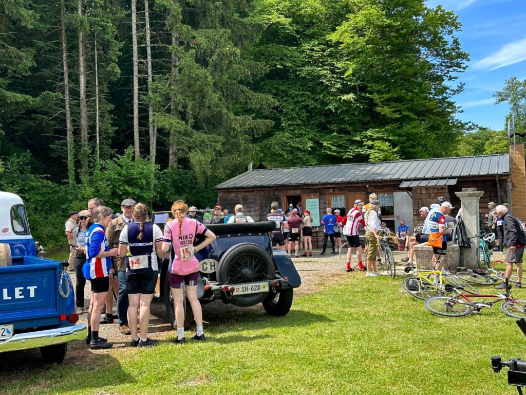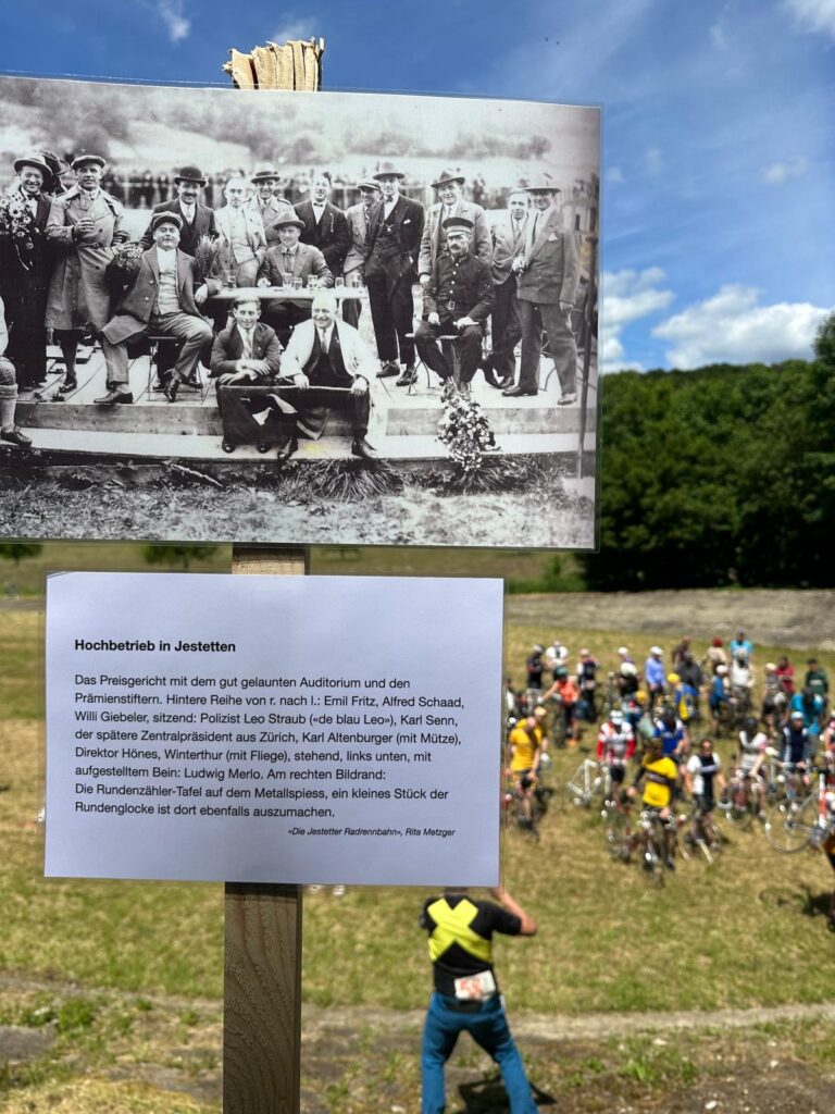 Danach folgen alle weiteren TeilnehmendenDie Route führt entlang der Hallauer Rebberge nach Trasadingen, über die Felder nach Wilchingen, weiter nach Osterfingen, und durch den Wald zur ehemaligen Radrennbahn in Jestetten – genau dort, wo vor 100 Jahren das erste Rennen stattfand.