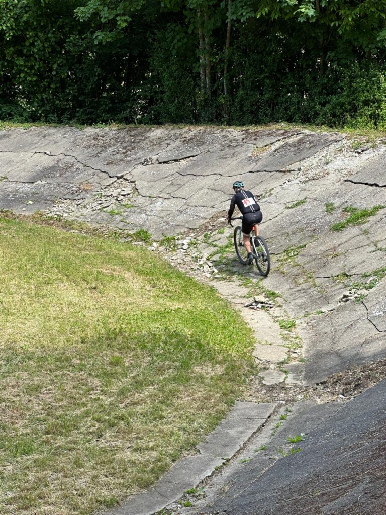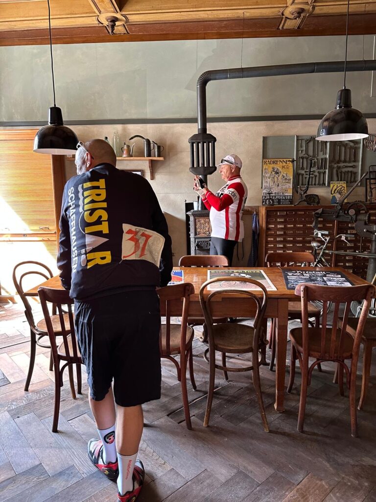 Zwischenhalt an der Radrennbahn mit Getränk, Fotodokumentation und einem geschichtlichen Rückblick zum Jubiläum