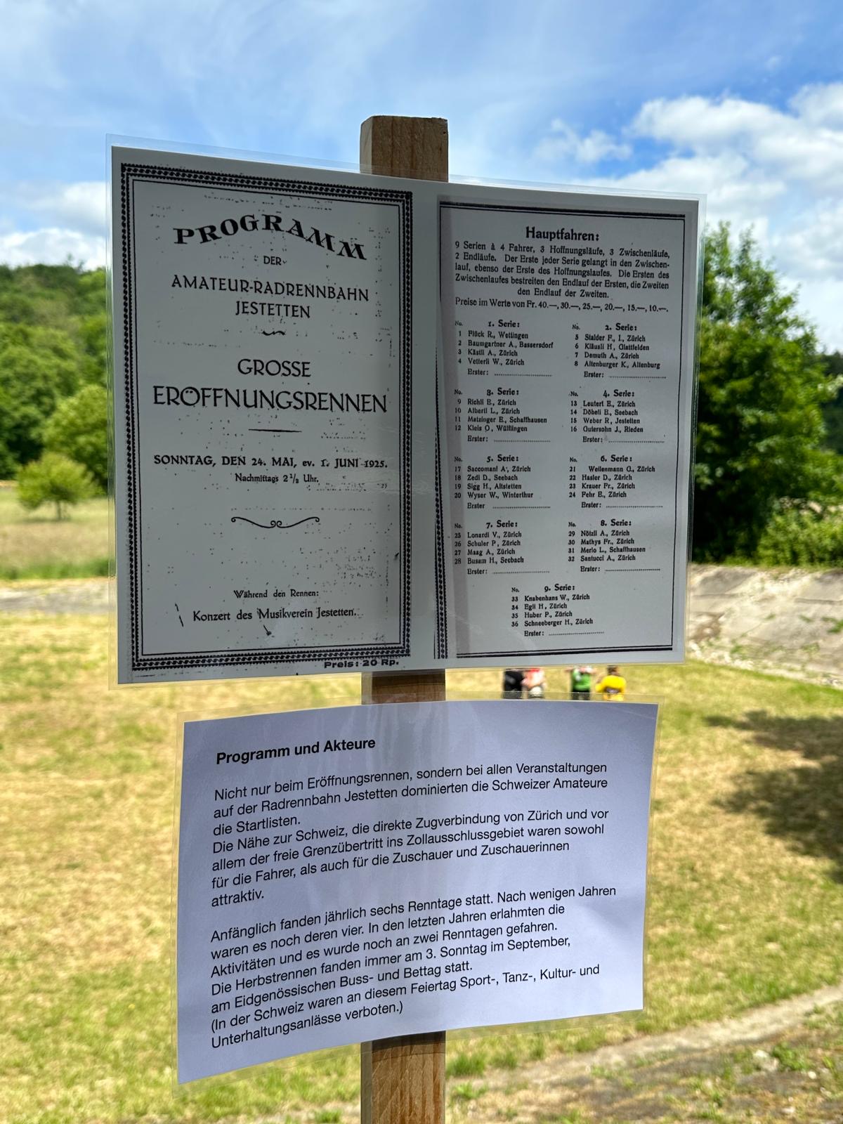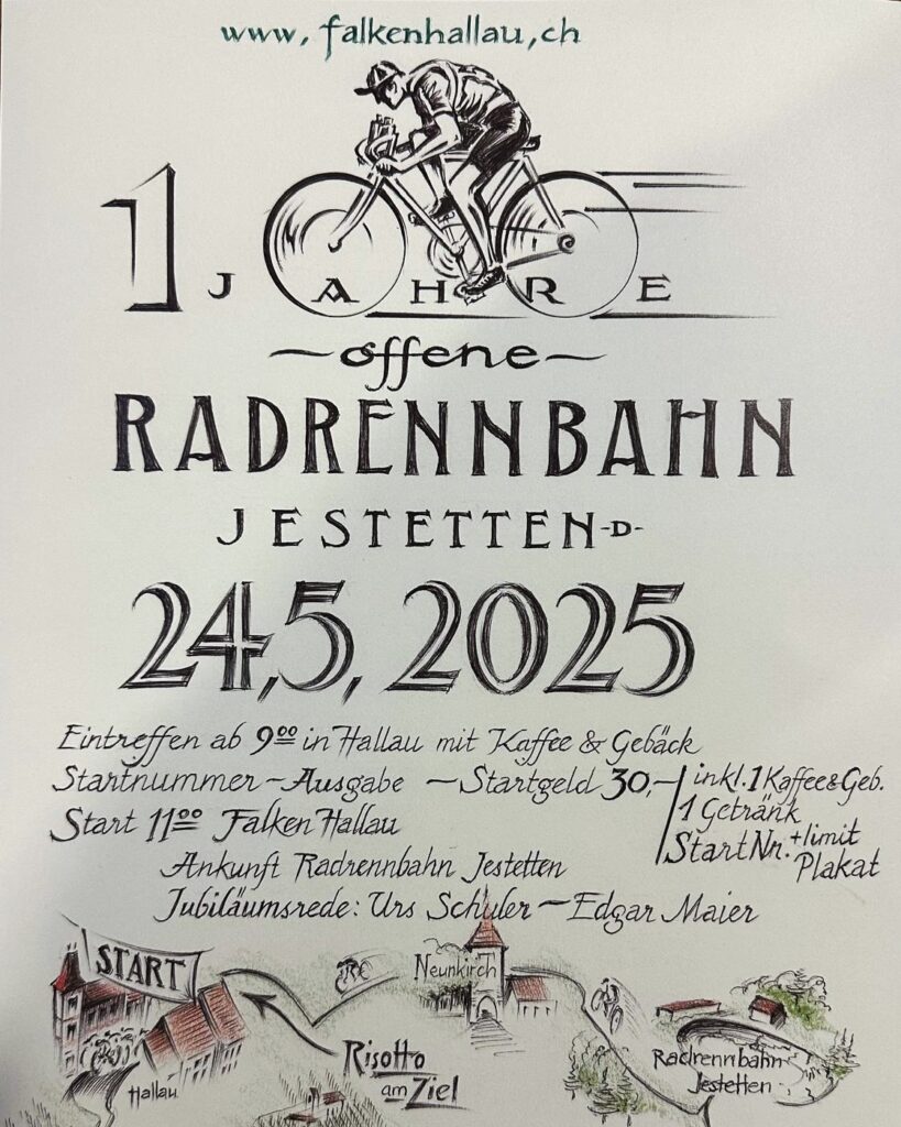 Am 24. Mai 2025 jährt sich die feierliche Eröffnung der Radrennbahn Jestetten zum 100. Mal. Zu diesem besonderen Anlass laden wir alle Fahrradbegeisterten zu einer stimmungsvollen Jubiläumsfahrt durch die wunderschöne Landschaft des Klettgaus ein – mit historischen Zwischenhalten, und festlichen Ausklang mit kulinarischen Genüssen.