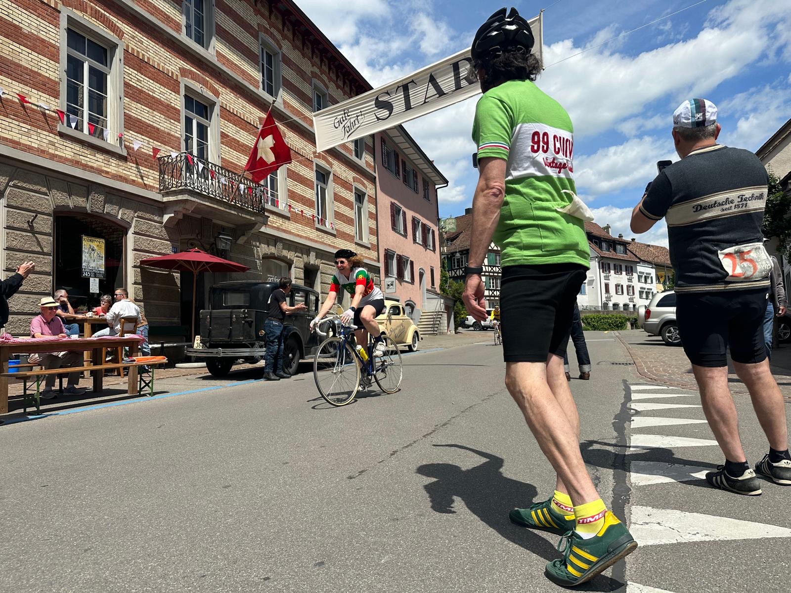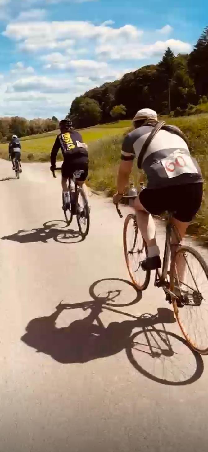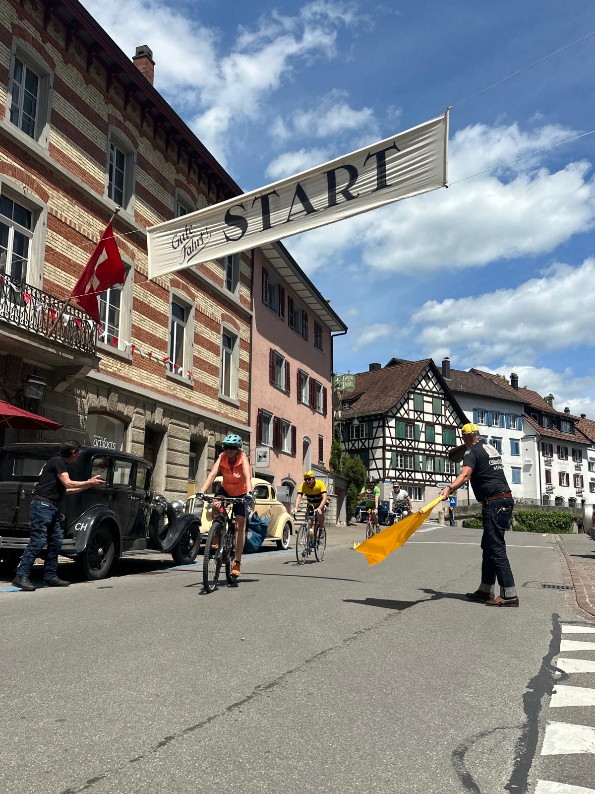 Danach folgen alle weiteren TeilnehmendenDie Route führt entlang der Hallauer Rebberge nach Trasadingen, über die Felder nach Wilchingen, weiter nach Osterfingen, und durch den Wald zur ehemaligen Radrennbahn in Jestetten – genau dort, wo vor 100 Jahren das erste Rennen stattfand.